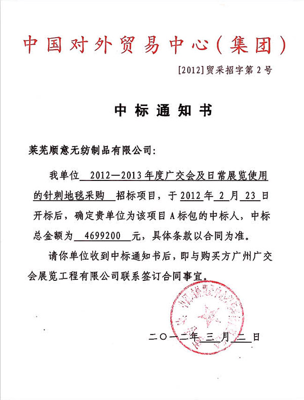 中國對外貿易中心(集團)中標通知書